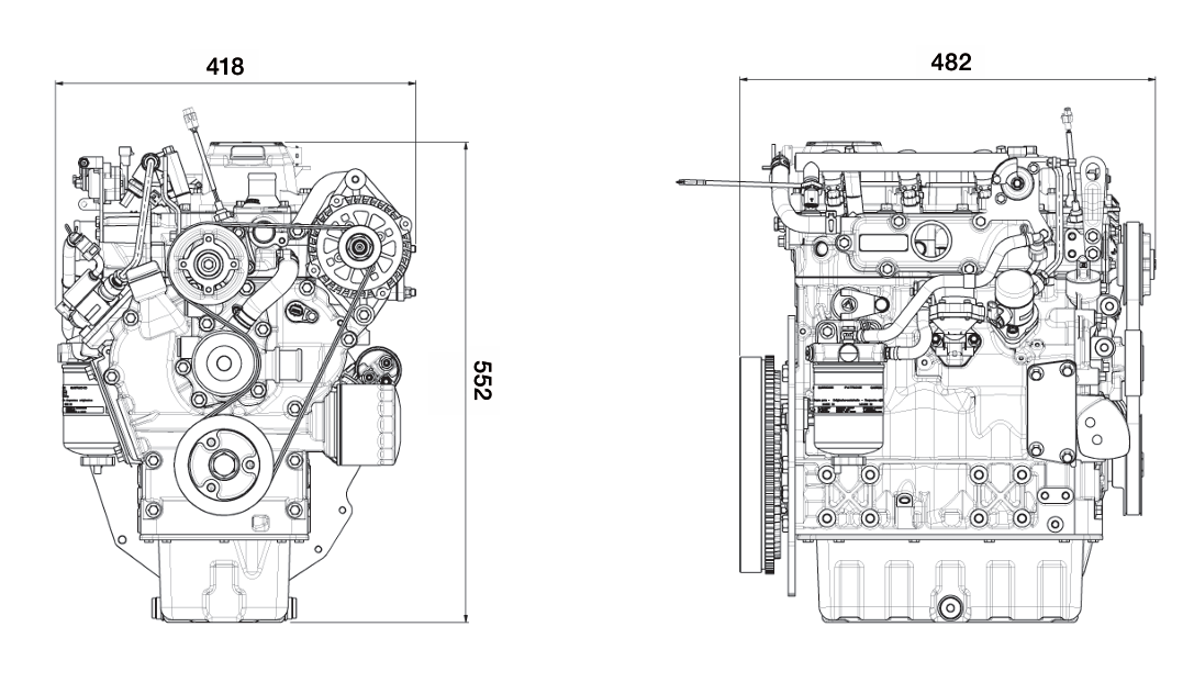 Il motore è raffreddato a liquido, dotato di un blocco motore in ghisa e testata in ghisa, che lo rende robusto e resistente in ambienti di lavoro impegnativi. Le dimensioni compatte (551x482x407 mm) e il peso contenuto di 121 kg lo rendono facilmente integrabile in diverse macchine.