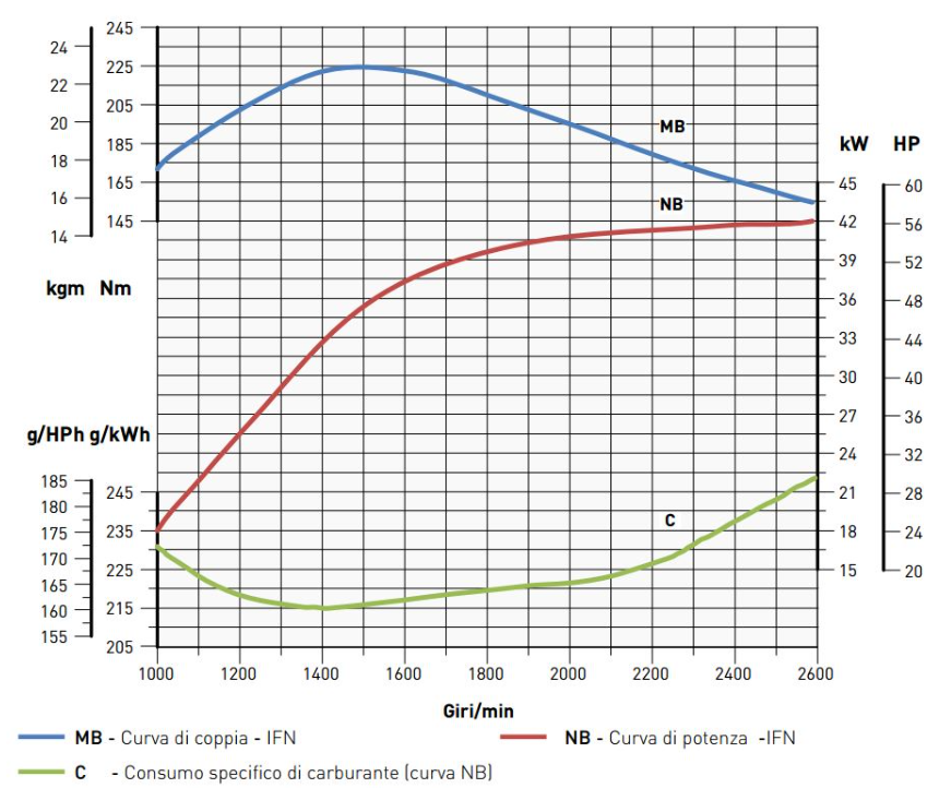 Potenza massima (IFN-ISO 3046 e ISO 14396)(kW@giri/min) 42@2400