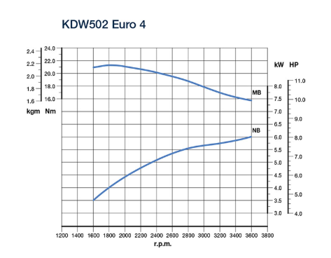 Il motore diesel Kohler KDW 502 è un compatto motore a 4 tempi con 2 cilindri in linea, raffreddato a liquido, con cilindrata di 505 cm³ e potenza di 8,6 kW.